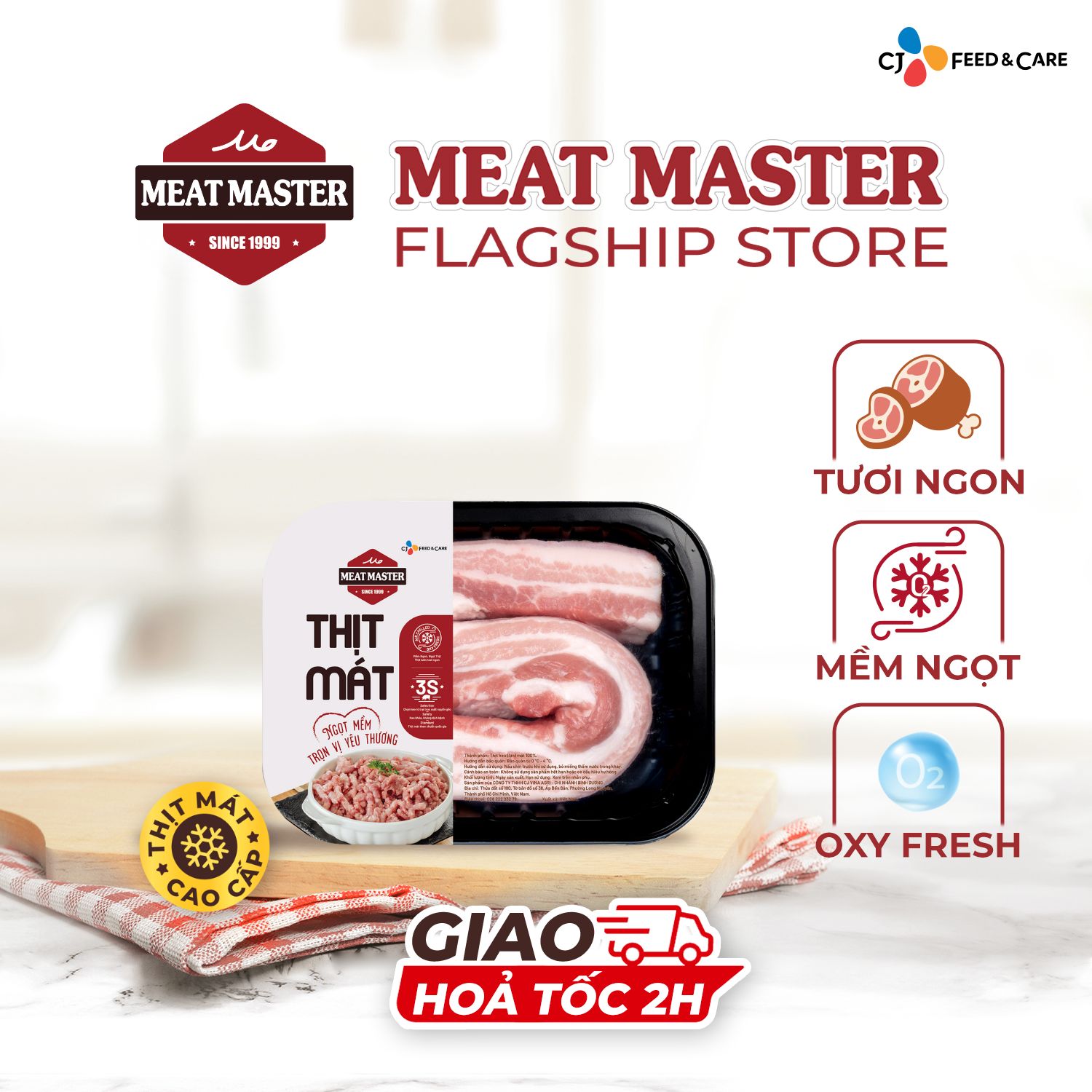 - Thịt được đóng gói vào khay bằng công nghệ Oxy Fresh.