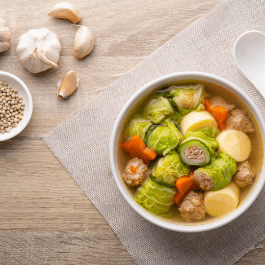 - Phi thơm đầu hành trong nồi lớn. Khi hành vàng, cho vào 1 muỗng canh nước mắm, kế đến cho vào 1,5 lít nước vào nồi. Nêm thêm 1 muỗng canh đường, 2 muỗng canh bột súp gà, 1 muỗng cà phê muối (có thể thêm bớt cho vừa khẩu vị của gia đình). Cho từng miếng bắp cải cuộn thịt vào nước sôi, nấu 30 phút đến khi bắp cải mềm thì tắt bếp.